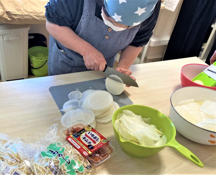 スライサーで切る予定が大根が大きすぎてはまらず・・・急遽手切りになりました。生徒様の手作り野菜は立派!薄ーく切るのに手間がかかりました・・・