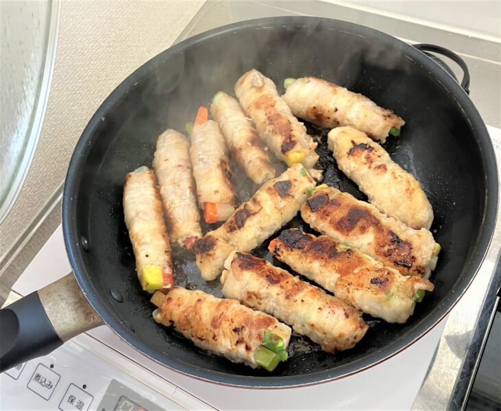 大根、人参、インゲンを巻きます。斜めに巻いていき野菜全部が巻かれる感じです。人参は赤と黄色がありカラフルになりました。