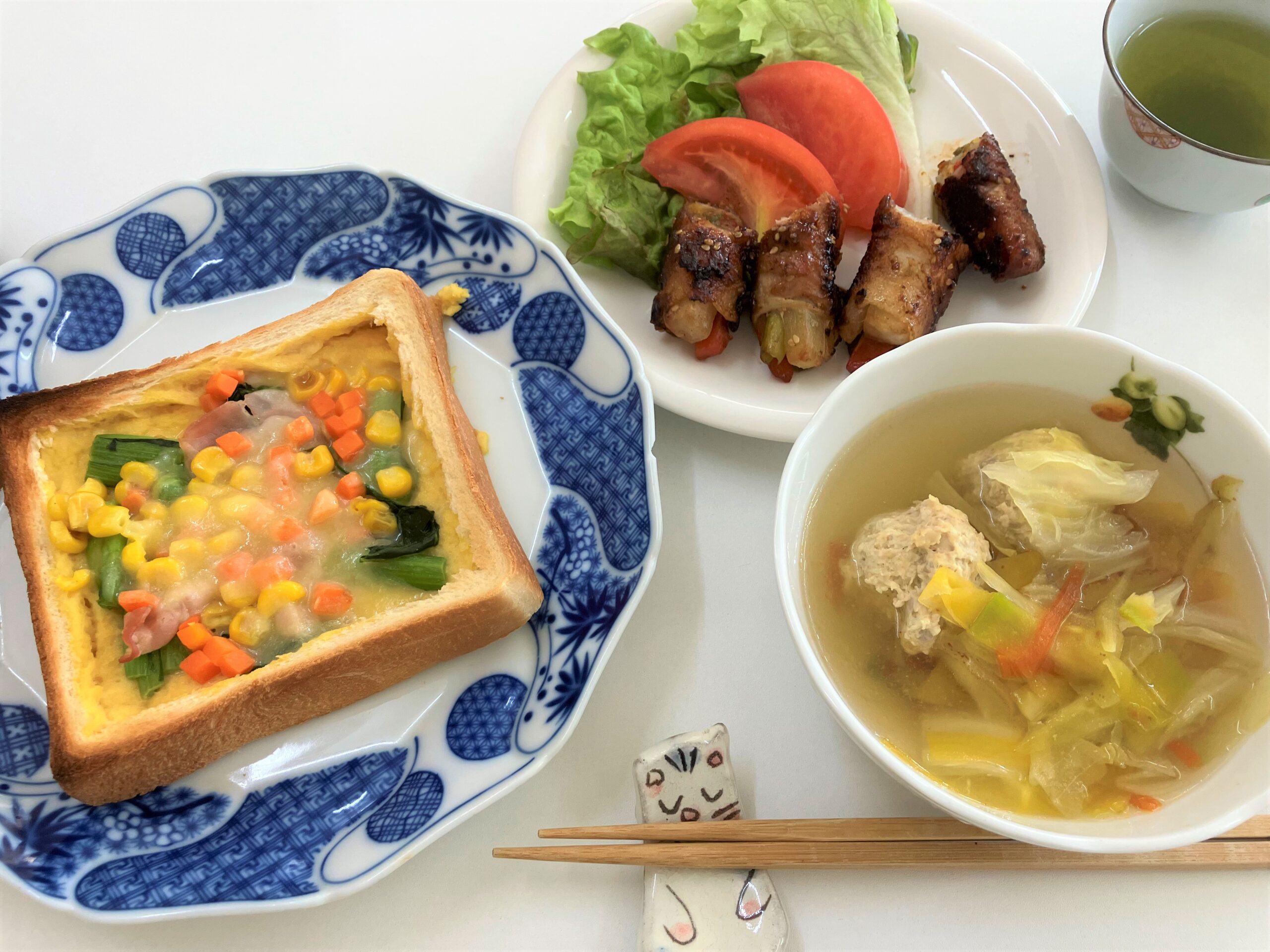 食パンでキッシュ 野菜の肉巻き焼き 肉団子のスープ