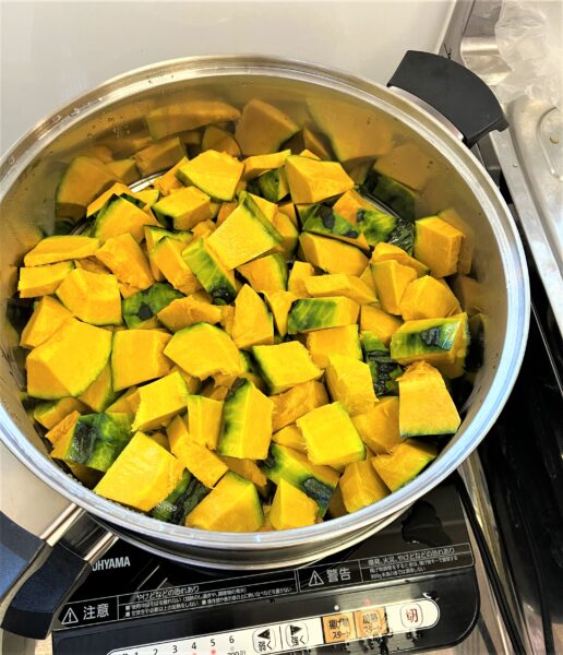 かぼちゃは生徒様が育てたものを1玉頂きました。蒸し器で蒸しましたがとても甘みのあるかぼちゃです。玉ねぎのみじん切りと合挽肉を混ぜてコロッケを作ります。