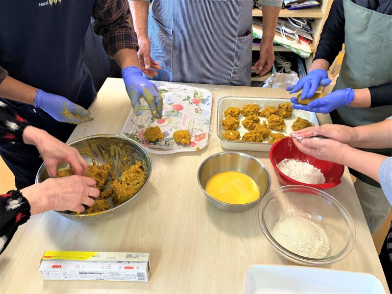 コロッケの衣付けはみなさんでワイワイ言いながら!玉ねぎと合挽肉は生を混ぜたので「火が通りやすいように薄く形を作りましょう」や「だんだん小さくなっていない?」など 笑