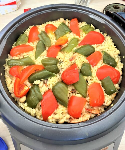 パエリア、炊きあがりました。おこげも出来てとっても美味しそうです。水加減もバッチリでした!