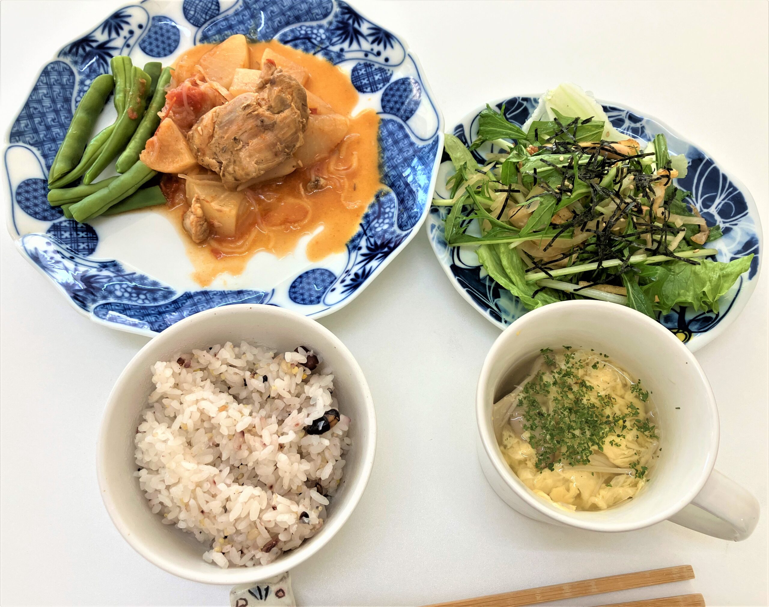 チキンの洋風煮込み 大根とお揚げのパリパリサラダ 卵スープ 雑穀入りごはん